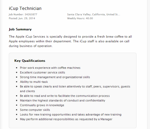 募集要項によると、Apple社員に入れ立てコーヒーを提供する「Apple iCup Services」の担当とのこと。仕事の内容はコーヒーマシンのリフィルや、マシンの修理、コーヒーの配達、社内カフェテリアのサポートなどで、コーヒーマシンを扱った経験や、接客スキルなどが求められます。