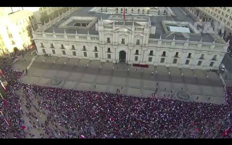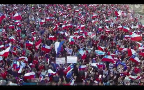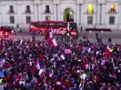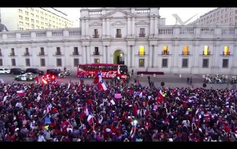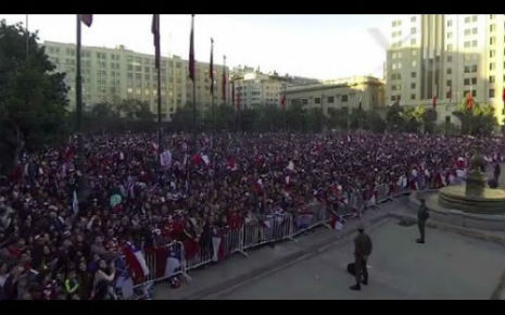 サッカーW杯ブラジル大会でFIFAランキング1位のスペイン代表を破るなど活躍をみせたチリ代表。決勝トーナメントではブラジル代表にPK戦の末敗れましたが、母国に帰還した選手たちを待っていたのは、膨大な数のサポーターでした。首都サンティアゴのモネダ宮殿(大統領官邸)前で撮影された映像が壮観です。