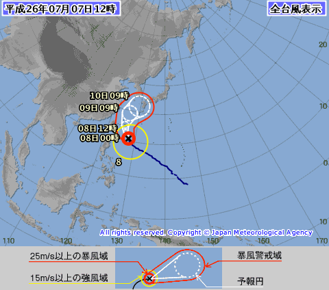 大型で非常に強い台風8号が、7月8日に猛烈な勢力で沖縄地方にかなり接近する見込み。記録的な暴風や高波となる恐れがあり、気象庁は特別警報を発表する可能性があるとしている。
