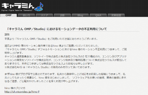 キャラミんは、3Dキャラクターに自動で振り付けをしてミュージックビデオを作れるソフト。有料の「キャラミんStudio」と無料の「キャラミんOMP」がある。これらソフトで、自身の作成したモーションが無断で使われているとMMDモーション作者のhinoさんが指摘し、問い合わせた経緯をWebで公開していた。制作会社は無断利用を認めたという。