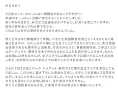 発表文で坂本さんは、19日から開催される「札幌国際芸術祭 2014」や、30日に予定していたパークハイアット東京の20周年記念ライブへの参加を中止することに関して、ファンや関係者に陳謝しています。また、「必ずきちんと治して戻ってまいります」と、活動復帰への意気込みも語っています。