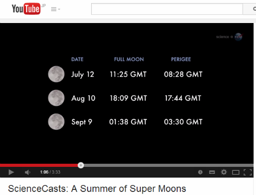 観測できるのはグリニッジ標準時で7月12日、8月10日、9月9日。7月は終わってしまいましたが、8月10日は満月が午後6時9分(日本時間11日午前3時9分)、最接近が午後5時44分(日本時間11日午前2時44分)と時間的に近いため、特に大きなスーパームーンとなりそうです。