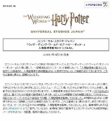ユニバーサル・スタジオ・ジャパン(USJ)は7月16日、15日オープンした「ウィザーディング・ワールド・オブ・ハリー・ポッター」の入場整理券に関して、一部報道やネットで、長時間並ばなければならないという誤報があったとコメントを発表した。