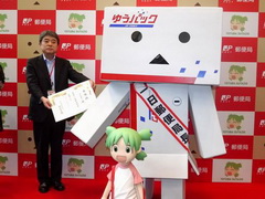 野口局長から一日郵便局長の任命書を受け取る、等身大のゆうパックダンボー