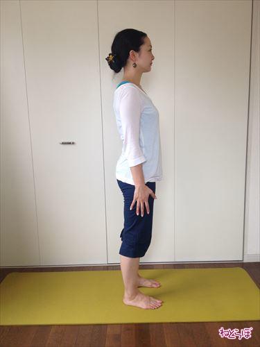 1. 足は肩幅に開き、両手をまっすぐ下ろして立ちます。