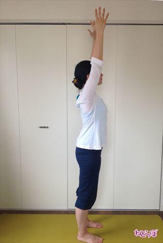 5. 息を吐ききったら、起き上がって両手を上げて、吐きながら元の姿勢に戻りましょう。