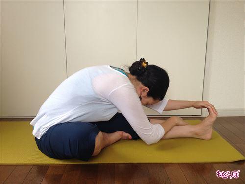 曲げ方を深めたいときは、一度大きく息を吸って背筋を伸ばし、吐きながら前屈を深めましょう
