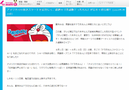 アメリカで放送している英語版「ドラえもん」が、8月1〜10日にテレビ朝日のイベント「テレビ朝日・六本木ヒルズ 夏祭り SUMMER STATION」で上映される。