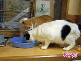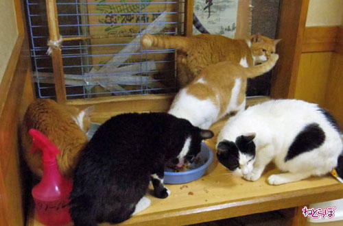 あまりの猫の数にあっけにとられていると、「うちで飼っている子は8匹だけなんだけどねぇ、外の子がご飯を食べに来るのよ」と、女将さんは続けた。座敷の窓から、次々に猫が入ってくる。女将さんは「ほらほら、食べたら外に出るよ」と、食事を終えた猫から順に外へ追いやる。外からご飯を食べにくる猫たちは、いわゆる地域猫で、ボランティアによる去勢・避妊が行われた印として、耳にV字カットが入っている。この日は5匹ほど外の子が食べにやって来た。