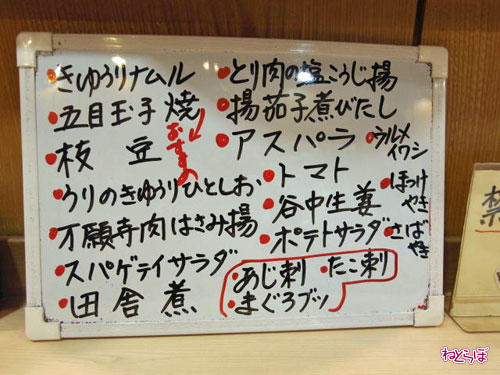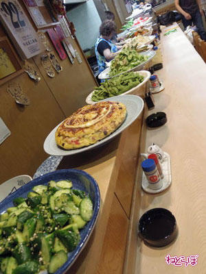 店内はカウンターと座敷。カウンターの上には、お酒に合いそうな家庭料理が並んでいる。
