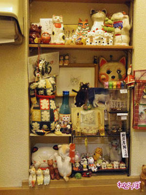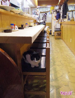 奥の座敷の机の下には猫が潜んでいることが多い。女将さん曰く「この子たちは身分をわきまえている」とのことで、お客さんが来ると猫ベッドや机の下にもぐってしまう子もいる。