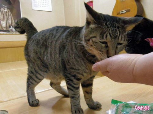 猫たちの食事が落ち着いた頃、縞模様のシマ君がご帰宅。「かーっ! うめぇな!」というおっさん臭いセリフを言いそうな勢いで女将さんの手からごはんをパクパク。