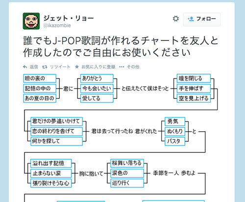 次に、@ikazombie(ジェット・リョー)さんが友人といっしょに開発したという、「誰でもJ-POP歌詞が作れるチャート」。