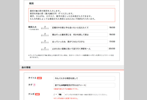 ボカロデューサーという自動作曲サービスを無料で使えるヤマハのボカロネット。1日3曲までタダで作曲してくれる伴奏をつけて、VOCALOIDが歌ってくれるというサービスだけど、普通そんなに歌詞書けないよね。