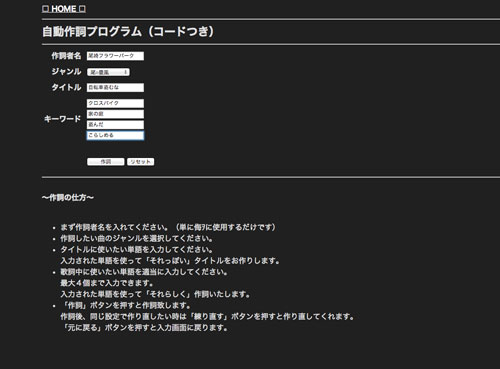 もうちょっと細かいカテゴリーの歌詞を生成できるサービス「自動作詞プログラム(コード付き)」というのも見つけました。4つのキーワードを入れることができ、ジャンルとして「J-POP」「尾○豊風」「浜省風」「筋肉少○帯風」というのがあります。