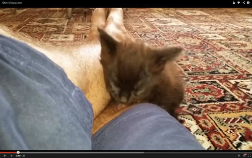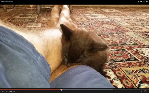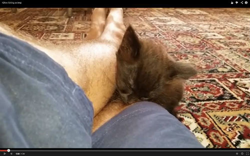 男性のふくらはぎの上に顔を載せてウトウトしている子猫ちゃん。男性の声に反応し、すね毛の生えた足をペロペロと毛づくろいを始めます。しかし、すぐにウトウトと再び眠りの世界へ。男性が足を動かすと、またペロペロ。そしてまた、ウトウト。