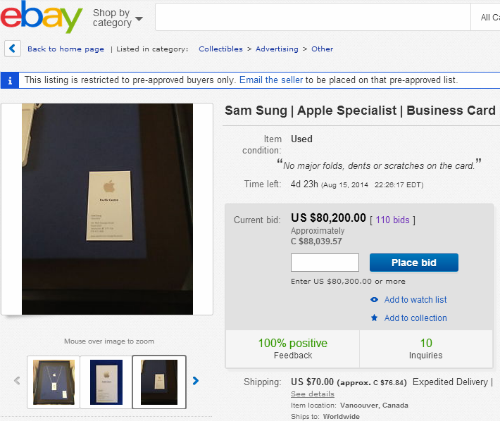 「サム・スン」という名前の元Apple従業員が、Apple時代の名刺をネットオークションに出品し、8万ドルの高値がついています。