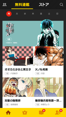 人気のマンガ作品を連載形式で無料で読むことができる。ラインアップは「進撃の巨人」のほか「Sエス―最後の警官―」「東京喰種トーキョーグール」といった人気作品や、週刊少年ジャンプで連載スタートしたばかりの新作「火ノ丸相撲」など毎週100作品以上。