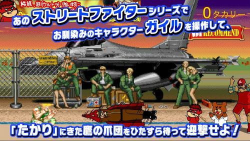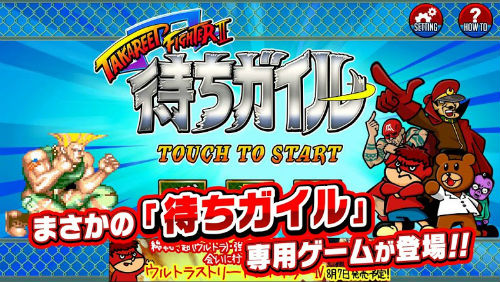 「ストリートファイター」シリーズでお馴染みのガイルの伝統戦法「待ちガイル」に特化したゲームで、画面をスワイプして、たかりにきた鷹の爪団をソニックブームかサマーソルトキックで迎撃する内容。20年以上変わらず完成された戦術と称された「待ちガイル」がまさかの専用ゲームになった。
