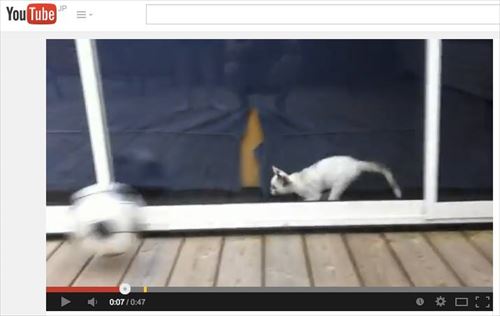 猫ちゃんのいる部屋の外でサッカーボールを蹴る飼い主さん。猫ちゃんは部屋の中から一生懸命ボールを追いますが、窓越しなので捕まえられません。ボールを追いかけて行ったり来たり。