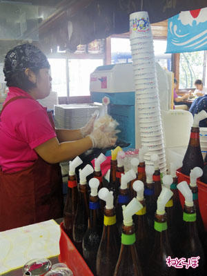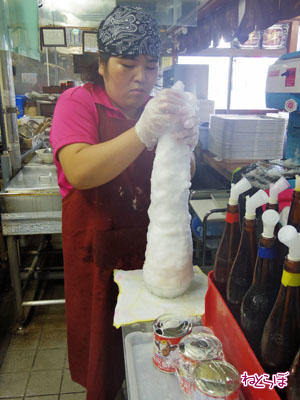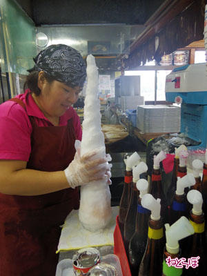 下の方からシロップをかけていく店員さん。こんなに高さがあり、バランスを崩すとポッキリと折れてしまいそうなものを片手で持っていることにも驚きだ。まさに匠の技!