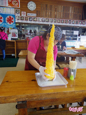 店員さんはさっそく、超巨大かき氷、その名も「宮崎のスカイツリーかき氷」作りに取りかかった。この高さ60センチの巨大かき氷は、店長の「お腹いっぱいになる氷を提供したい」という思いから、スカイツリーが建設されるはるか昔の30年以上前からこの形で存在しているそうだ。筆者が幼い頃はまだスカイツリーもなかったので、普通に「氷」と呼んでいたのだが、スカイツリーができた2年前から、名称が「スカイツリーかき氷」になったという。値段は500円〜750円。
