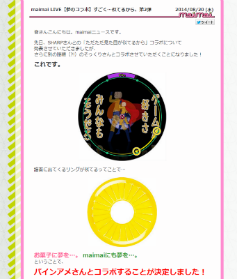 ゲームの譜面に出てくるリングがパインアメに似てるということで、8月30〜31日に行われるmaimaiのライブイベント「maimai LIVE 2014 〜洗濯祭〜」でパインアメ、オレンジアメのサンプルを配布する。