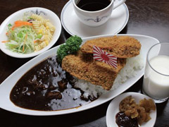 大鯨カレーは、艦娘のモデルにもなった潜水母艦「大鯨(たいげい)」をトッピングなどで再現したカレー。名前にちなんで鯨(くじら)カツが2枚のっていて、並べ直して飛行甲板っぽくすることで、潜水母艦でありながらもいざというとき空母に改装できる大鯨らしさを演出できる。ルウはコーヒーを隠し味に使った黒カレーで、後から辛さが迫るそうだ。