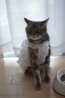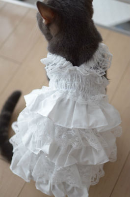 こちらのネコの名前は陽(ハル)君。性別はオスで、今夏に3歳になったそうです。着用しているのは“犬用”のウェディングドレス。それでも、バッチリ着こなしていてとってもかわいらしいです。Twitter上でも「うぉおおおお」「きゃーかわいい」と歓声が上がっていました。