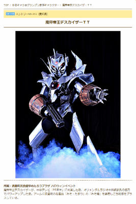 そしてデスカイザーとは別に、「魔界帝王デスカイザーTT」もエントリー。デスカイザーが中京テレビの番組「PSIII世」に出演したときのパワーアップした姿だそう。アームには武豊町の名産品「みそ・たまり」の「みそ樽」を装着。確かにちょっと強そうになってますが、チープ感は相変わらずです。