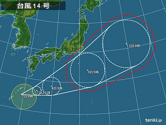 7日午前9時に奄美大島の南約140キロメートルで台風14号が発生しました。中心気圧は998ヘクトパスカル、中心付近の最大風速は毎秒18メートル。時速25キロの速さで北東へ進んでいます。