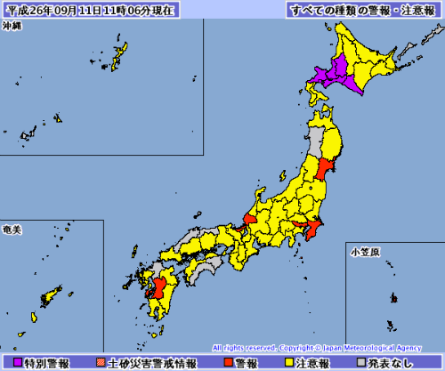 気象庁の警報・注意報(11日午前11時6分時点)
