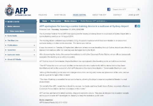 麻薬や爆発物をかぎ分ける探知犬の訓練に使った爆薬を空港に置き忘れていたとして、オーストラリア連邦警察(AFP)が謝罪しました。