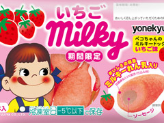 「ペコちゃんのいちごミルキードッグ」は、発売中の「ペコちゃんのミルキードッグ」(紹介記事)の第2弾。いちご味になり、不二家の「いちごミルキー」のような甘酸っぱさと、まろやかな甘味に仕上がっているそうです。