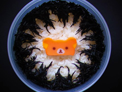 丸いお弁当箱の真ん中に、チョコンと置かれたリラックマ。それはいいけど、周りのひじき、なんなの!!!!! リラックマに向かって、真っ黒なひじきが、おどろおどろしいオーラのように伸びています。リラックマさんが暗黒のパワーに満ちている……魔王の復活は近いぞー!!!!!
