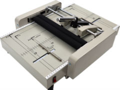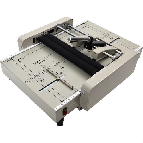 本体に紙をセットしたあと、ハンドルレバーを押し戻すだけで、ステープラーを打ち、自動で紙折りしてくれる。ハンドルレバーに手をかけてから最速3秒で中綴じ製本ができるという。用紙サイズはA3からA5までに対応。重ね折り枚数は推奨最大16枚。