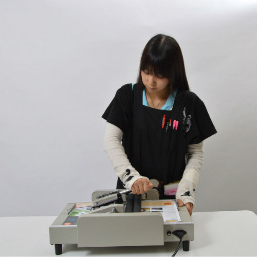 レバーを押して戻すと中綴じ製本 「フルオートマチック製本マシーン」サンコーから