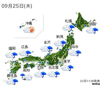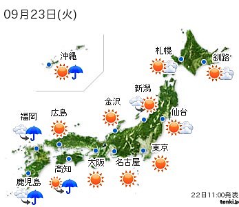 23日は、北海道から中国地方は秋晴れですが、九州や四国は雨が降り出すでしょう。24日は、九州から東海で雨が降りそうです。25日は、雨の範囲がさらに広がって、沖縄以外は曇りや雨となるでしょう。