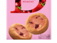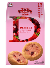 カントリーマアムデザート(ベリーベリータルト)はタルトに見立てた、カントリーマアム初の「中が見える」タイプ。ストロベリー味の生地に、クランベリー果肉とホワイトチョコチップを練り込んで焼き上げた。参考小売価格は税込270円(5枚入り)。