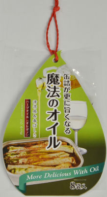 「カップラーメンが更に旨くなる魔法の粉」「レトルトカレーが更に旨くなる魔法の粉」に続く、「○○が旨くなる魔法」シリーズ第3弾。スペイン産エキストラバージンオリーブオイルと食用菜種油を使い、隠し味にオレガノを入れており、「安価な缶詰が本格的なヨーロピアン料理に早変わり」するという。