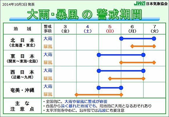 上の図をご覧下さい。各地の大雨や暴風に警戒が必要な期間です。