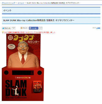 「SLAM DUNK Blu-ray Collection」の発売記念の一環で、日本全国のアニメイトを巡回している「安西先生タプタプカウンター」。安西先生のアゴを思う存分タプタプできるステキなマシンですが、なんとタプタプされすぎて壊れてしまいました。