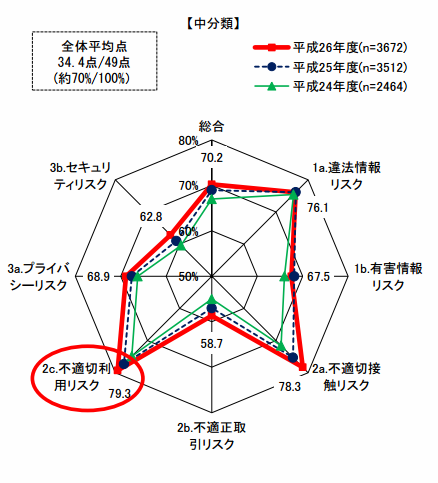 テストの結果、青少年のインターネット・リテラシーは上昇しており、全体の正答率が70.2%と昨年度(68.9%)より上がっている。年々、リスク対応能力の向上がみられるという。リスク対応の中でも、料金や時間の浪費に配慮した利用について正答率が相対的に高く、適切なコミュニケーションに関する能力も向上。一方で電子商取引の問題への対処やセキュリティ対策は相対的に正答率が低かったという。