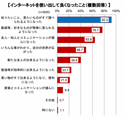 インターネットのプラス面を感じている青少年は90%以上。知りたいこと、見たいものがすぐに調べられる、動画など好きなものが簡単に見られる、友人・知人とのコミュニケーションが活発になったといったプラス面を挙げる回答が多い。