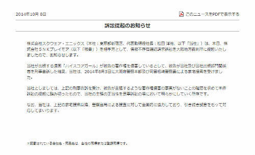 SNKプレイモアは8月に、スクウェア・エニックスが出版する漫画「ハイスコアガール」が許諾なく同社のキャラクターを複製使用したとして刑事告訴した。これによりスクウェア・エニックスは大阪府警察に家宅捜索を受けた。