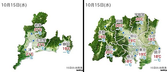 上の画像をご覧下さい。ほとんどの地点で白や青の表示になっており、西日本や東日本でも多くの所で15度を下回っている事が見て取れます。