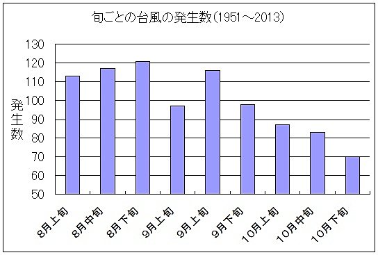 次に下の図をご覧ください。こちらは1951年から昨年までの台風の発生数を、旬ごとに集計したものです。