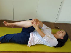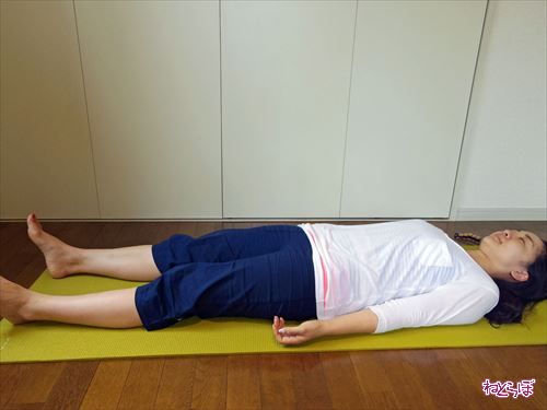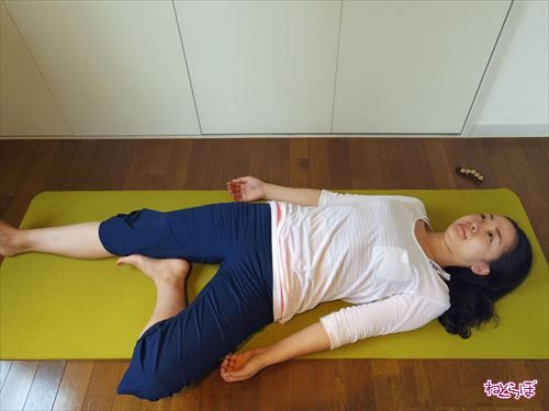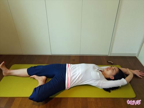 お尻と股関節のストレッチの後は、全身を伸ばしてリラックスさせるため、横になったまま、次に説明する「寝転がった木のポーズ」で体を整えます。