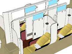 個室型シート(プレミアムシート)の採用は西日本鉄道では初。座席はカーテンではなくパーティションでしっかりと仕切られており、各座席には専用の空気清浄機も設置した。そのほか本革仕様のシートには、従来のプレミアムシートにはなかった、背面マッサージや電動リクライニング、背面ヒーター、座面送風などの機能を搭載、備え付けのタブレット端末では、インターネットのほか電子書籍などのコンテンツが無料で楽しめるという。
