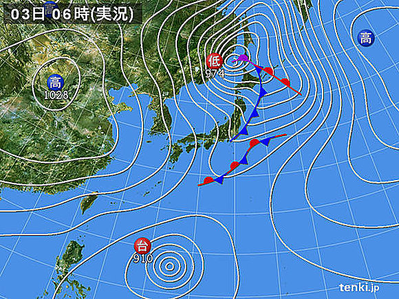 北海道付近に発達した低気圧があり、今後さらに発達しながら北へ進む見込みです。日本付近は等圧線の間隔が狭くなっています。きょう3日(文化の日)は全国的に北よりの風が強いでしょう。